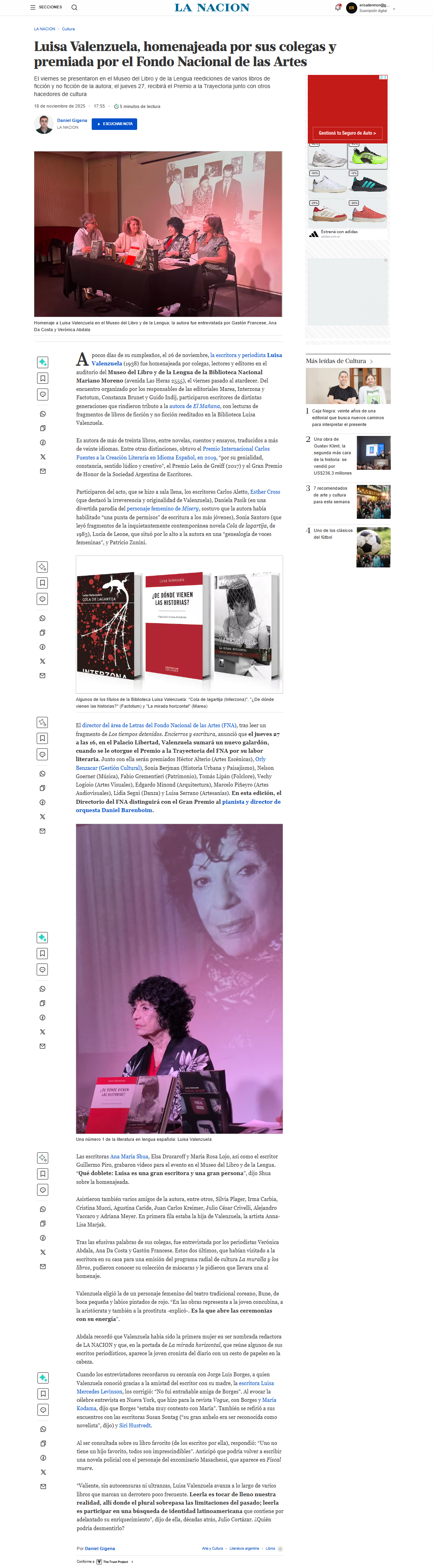 El director del área de Letras del Fondo Nacional de las Artes (FNA), tras leer un fragmento de Los tiempos detenidos. Encierros y escritura, anunció que el jueves 27 a las 16, en el Palacio Libertad, Valenzuela sumará un nuevo galardón, cuando se le otorgue el Premio a la Trayectoria del FNA por su labor literaria. Junto con ella serán premiados Héctor Alterio (Artes Escénicas), Orly Benzacar (Gestión Cultural), Sonia Berjman (Historia Urbana y Paisajismo), Nelson Goerner (Música), Fabio Grementieri (Patrimonio), Tomás Lipán (Folclore), Vechy Logioio (Artes Visuales), Edgardo Minond (Arquitectura), Marcelo Piñeyro (Artes Audiovisuales), Lidia Segni (Danza) y Luisa Serrano (Artesanías). En esta edición, el Directorio del FNA distinguirá con el Gran Premio al pianista y director de orquesta Daniel Barenboim.